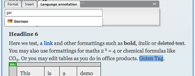 The WAI Language Plugin enables the editor to add language annotations to the content.